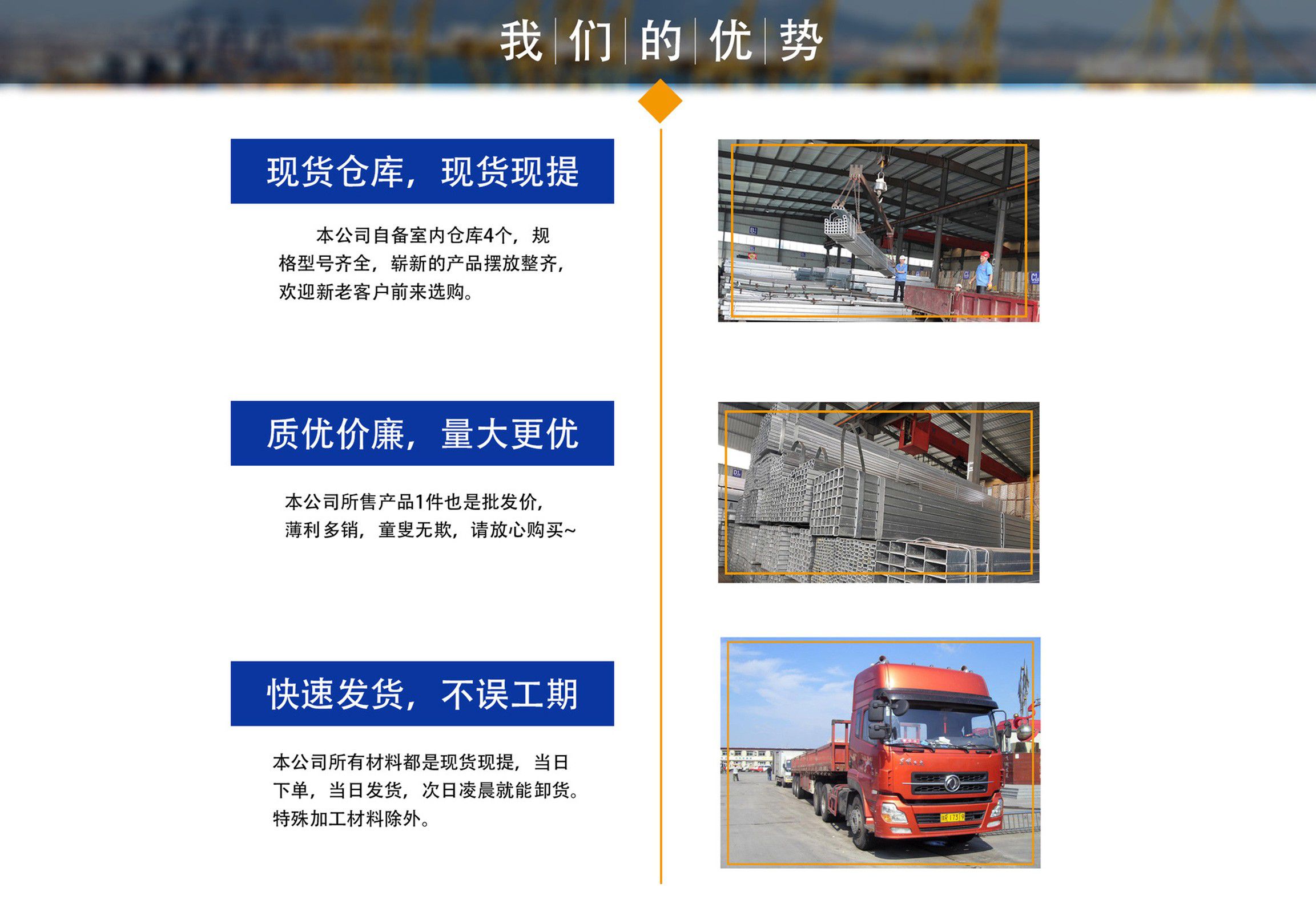 天津鍍鋅方管廠位于天津市靜海大邱莊工業(yè)區(qū),交通便利,地理位置優(yōu)越。我廠占地面積近9000平方米,注冊資金1000萬元,主要從事鍍鋅方管,鍍鋅方矩管,熱鍍鋅方管,鍍鋅方管廠家等產品的生產及銷售,現(xiàn)生產設備已擴大到六條,年生產量十萬噸左右占地面積近兩萬平米。銷售網絡遍及全國,受到廣大用戶認可。公司恪守以誠信為本,立業(yè)為眾的經營理念,以可靠的質量、合理的價格、優(yōu)質的服務、卓絕的信譽、期待您的關注和支持。 公司庫存量大,材質規(guī)格齊全,沒有規(guī)格及特殊規(guī)格材質方管可及時定貨生產,我公司經營方式靈活,批零兼營、一支起售,并可為客戶辦理鐵路、公路運輸,7*24小時為您服務,歡迎新老客戶來電垂詢。 公司一直堅持“以質量求生存,以產品求發(fā)展,以信譽保合作,以服務贏客戶”的經營方針,客戶遍及大江南北,獲得了良好的聲譽與回報,在以后的發(fā)展歷程中,我們愿與廣大客戶攜手并進,共創(chuàng)輝煌。 熱忱歡迎新老客戶蒞臨指導、洽談業(yè)務!...